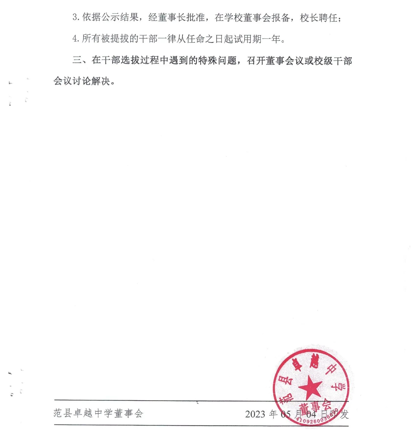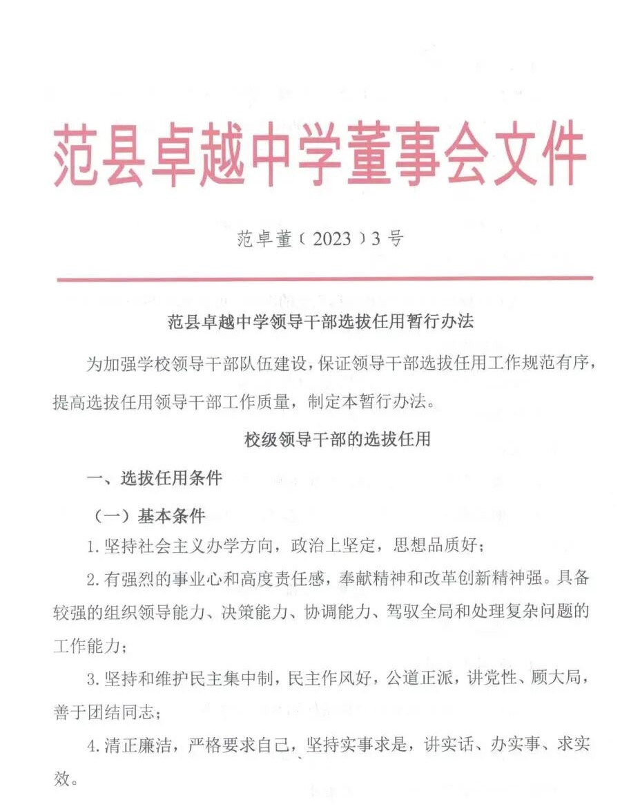 根据《范县卓越中学领导干部选拔任用暂行办法》规定,现对王燕荣、郑丽红、王玉标、范永辉、赵福鹏五位同志拟为中层干部考察人选进行业绩公示。社会家长、学校教职工等,如对人选有不同意见或认为有不良反映等问题,请于2025年10月27日至11月3日,实名向“范县卓越中学”网站:http://www.fxzyzx.cn/“校长信箱”留言。