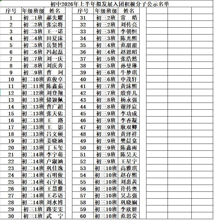 为锻造先进青少年队伍,培养担当民族复兴大任的时代新人,范县卓越中学严格按照《范县卓越中学发展团员工作实施办法》,秉持“品学兼优、全面发展”原则,经综合考察学生政治素养、学业水平、日常表现与发展潜力,从严从实完成资格审核。现将本批次入团积极分子名单予以公示,主动接受师生及家长监督,确保环节清晰、程序规范、结果公正。