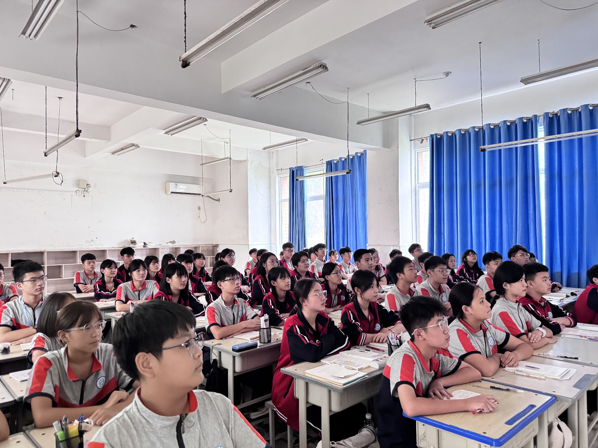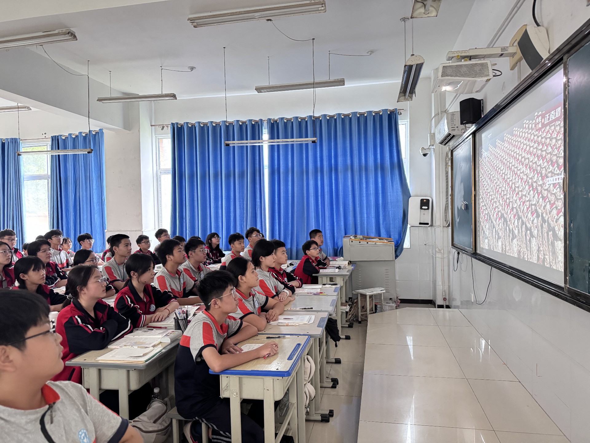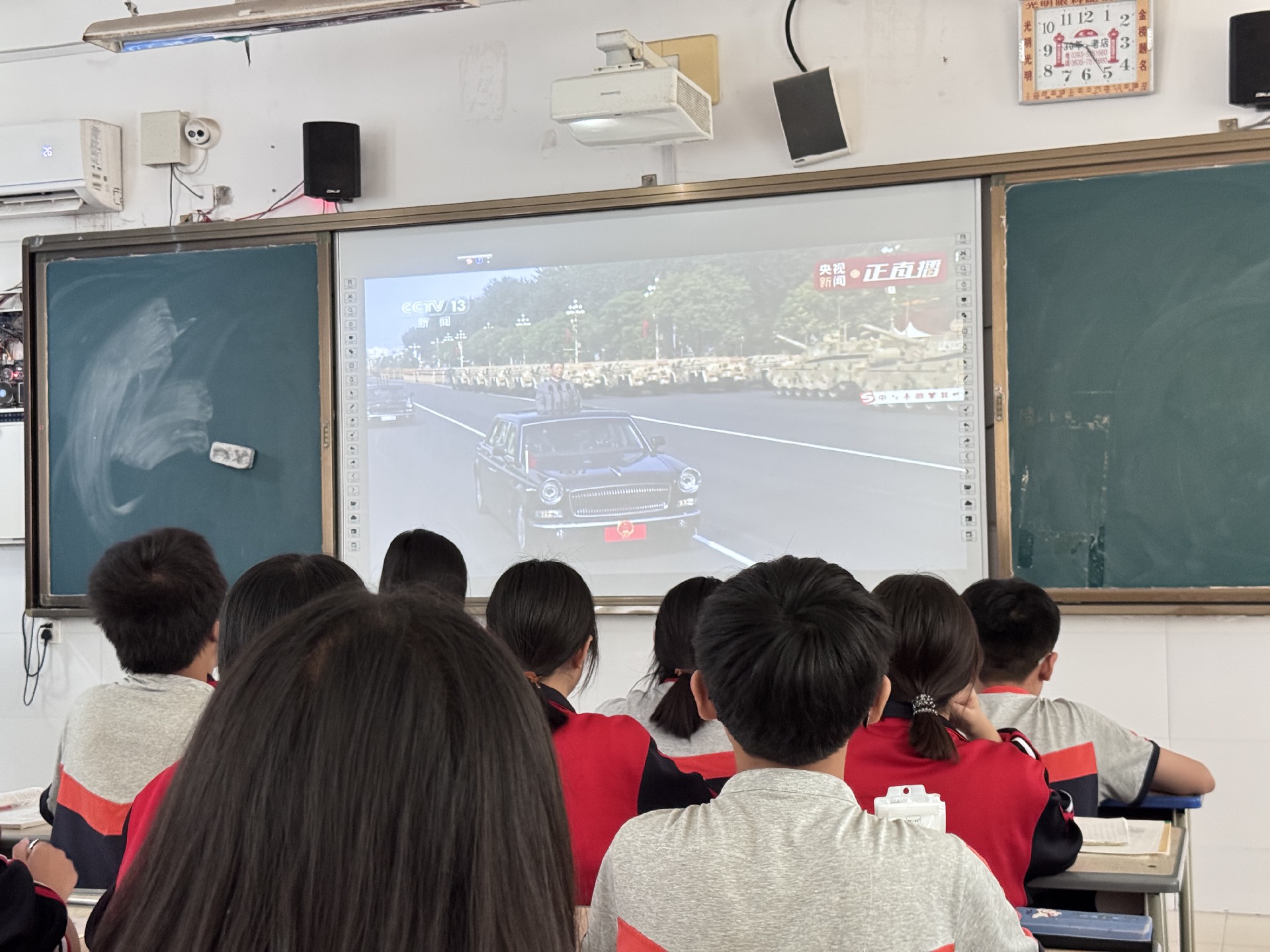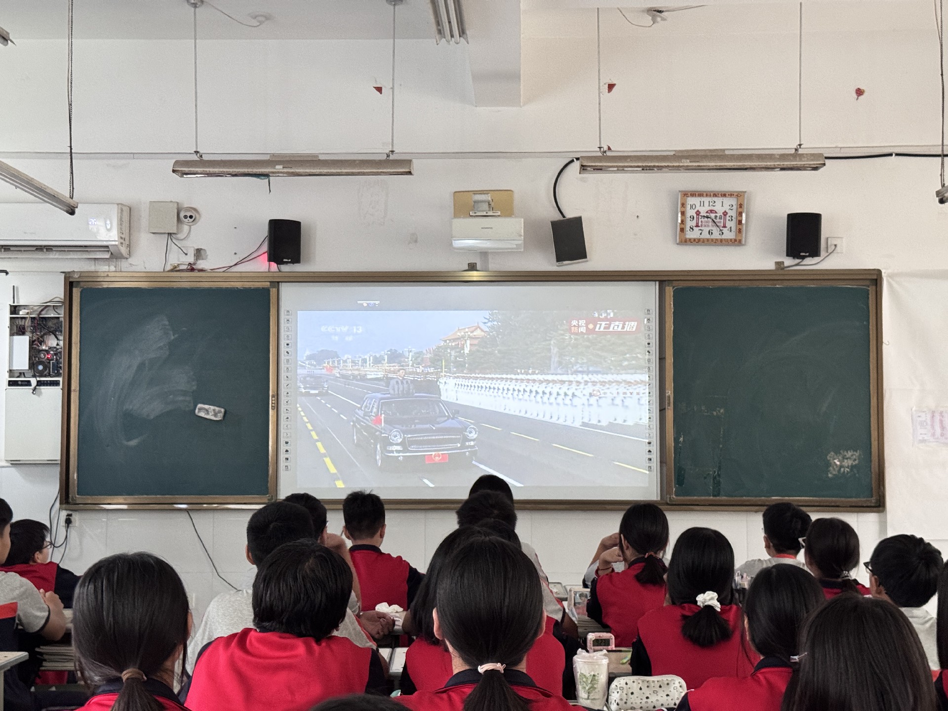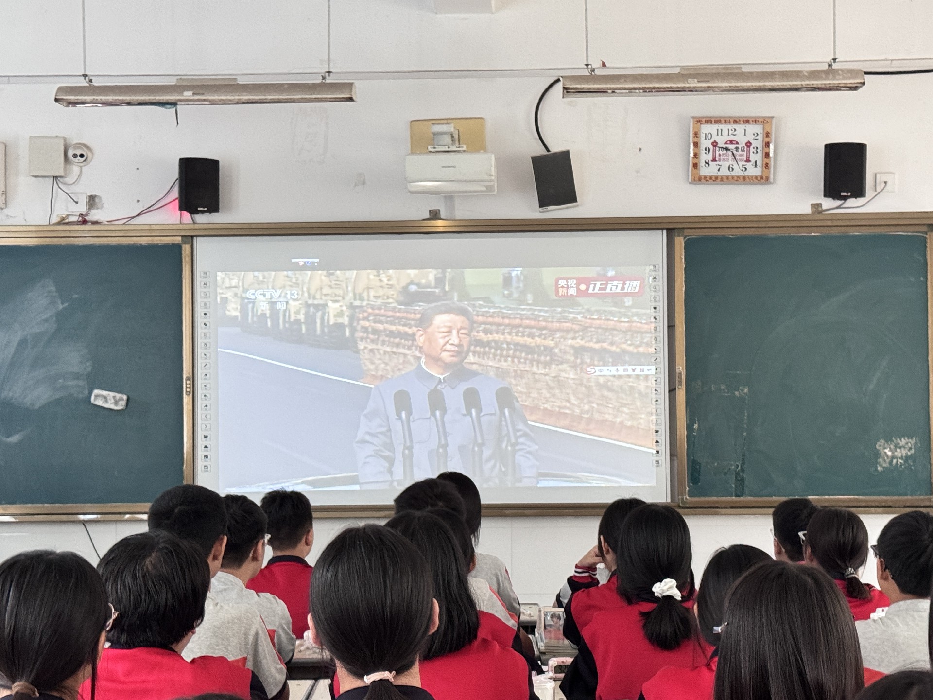 早上8时,同学们就已整齐地坐在教室中,怀着期待的心情等待阅兵式的开始。9时,阅兵活动正式开始,中共中央总书记、国家主席、中央军委主席习近平发表重要讲话,随后进行了庄严的阅兵仪式。同学们全神贯注地盯着屏幕,当看到整齐的徒步方队、先进的装备方队以及威武的空中梯队依次通过天安门广场时,教室里不时响起阵阵惊叹声和掌声。