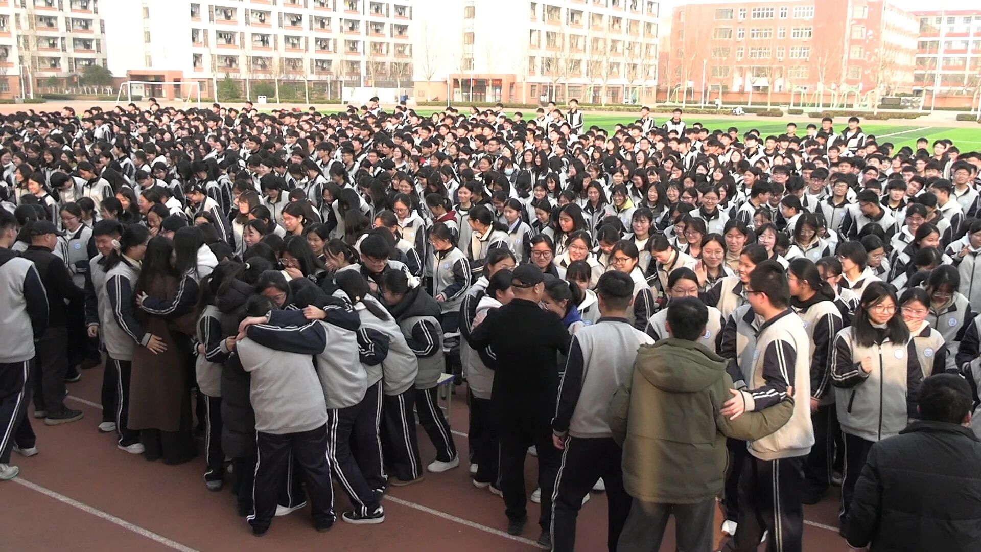 感恩静思环节,同学们回想起父母斑白的鬓角、师长殷切的目光,不禁潸然泪下。看着身旁的老师,同学们蜂拥而上,紧紧相拥,一句句“老师,您辛苦了”此起彼伏,师生情谊在这一刻凝结成最温暖的力量。