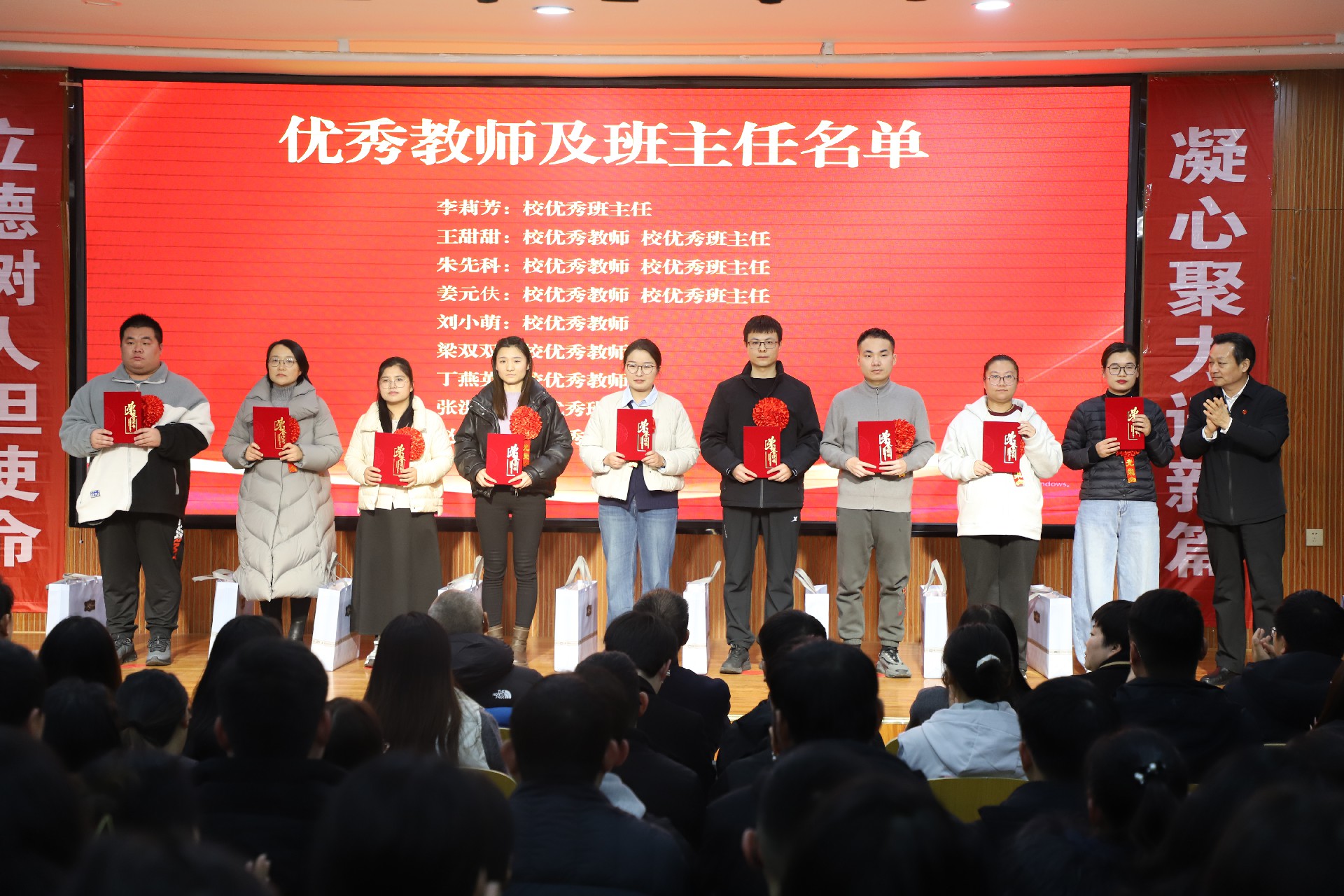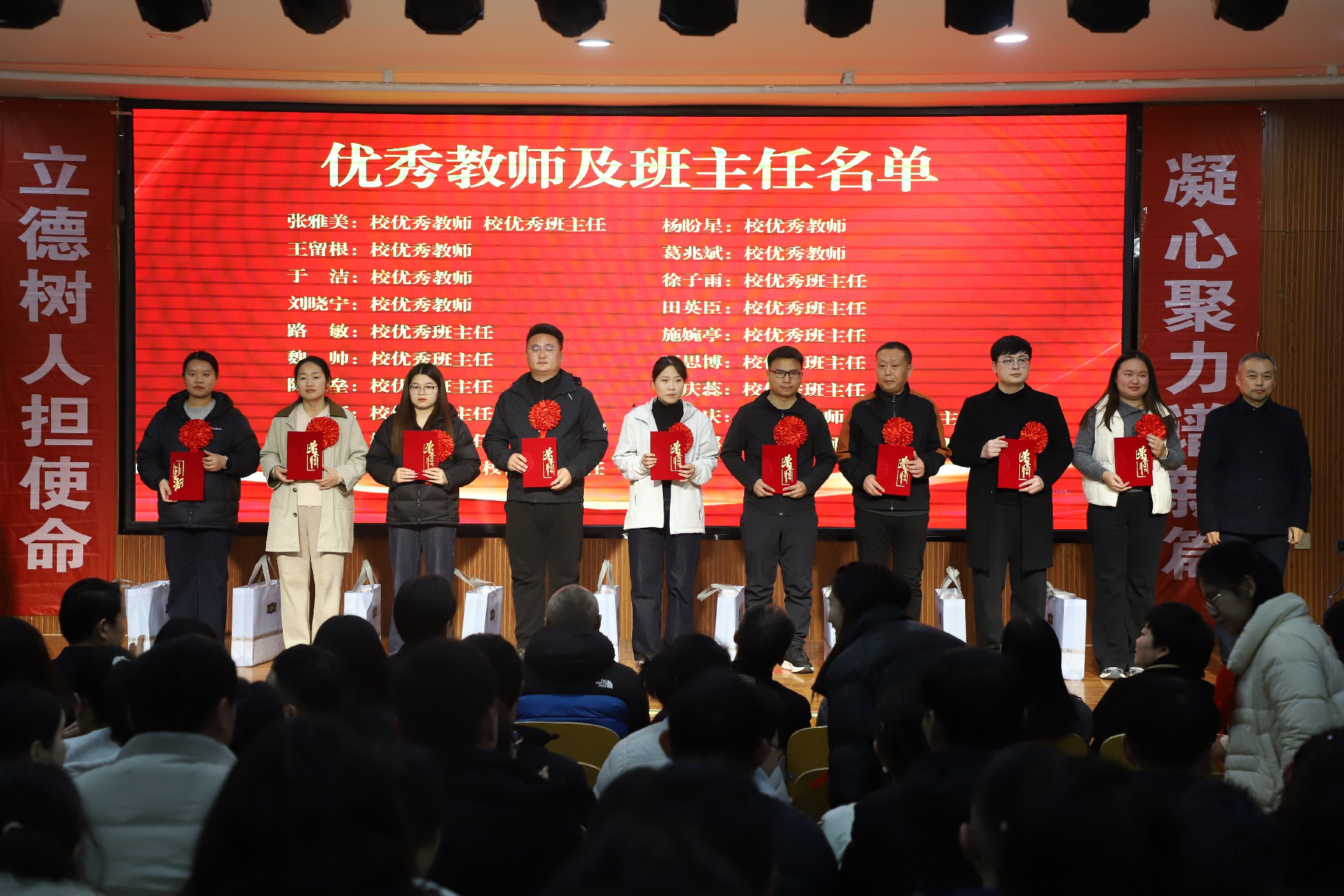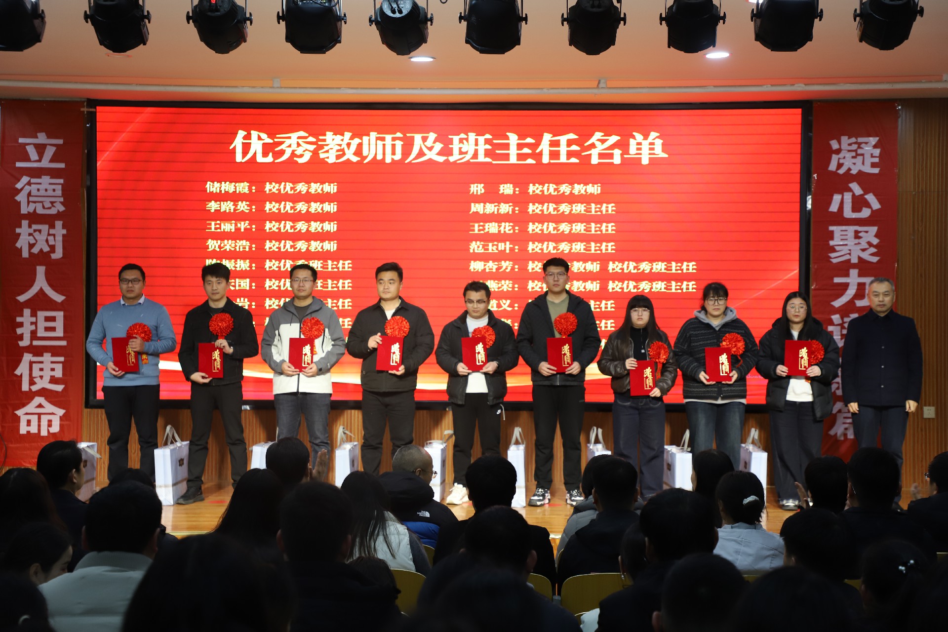 行政楼报告厅内灯光璀璨,气氛庄重。主席台屏幕上“颁奖仪式”四个大字鲜明夺目,两侧竖幅“立德树人担使命”“凝心聚力谱新篇”与对面横幅“聚人心鼓干劲扬帆起航 树标杆立楷模再创辉煌”遥相呼应,凝聚成一股澎湃的奋进之力。墙面联句“春播桃李三千圃 秋来硕果满神州”“今日共庆园丁绩 明朝再谱育人篇”,以凝练笔触礼赞教育耕耘,寄托深远期许。整个会场洋溢着致敬卓越、鼓舞人心的昂扬氛围。