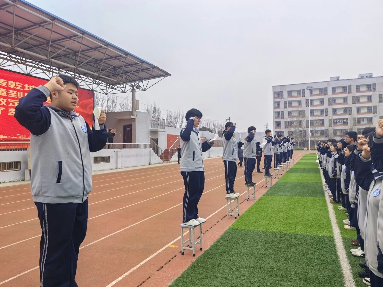 “挑战极限,超越自我”“百日鏖战,誓创辉煌”……各班依次登台,喊响专属誓言。声浪此起彼伏,一浪高过一浪,如惊雷贯耳,似战鼓雷鸣,尽显少年锐气与豪情。