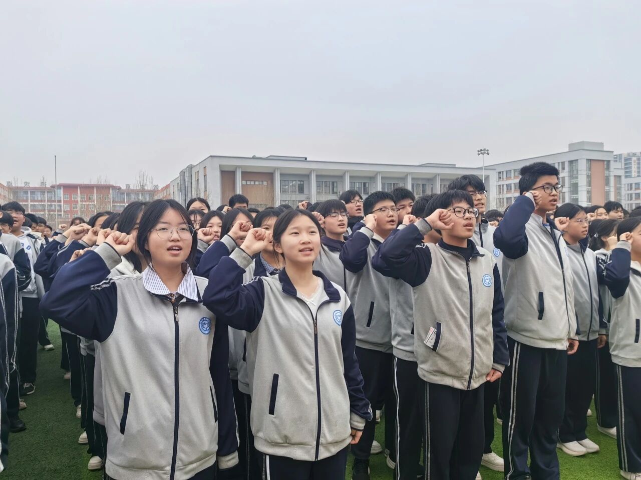 在领誓人叶胜博的带领下,全体同学面向主席台发出集体最强音。七百余只右拳紧握,七百余道目光如炬,震天的誓言直冲云霄,是冲锋的号角,是必胜的信念,淋漓尽致地展现出卓越学子无畏挑战、奋勇争先的昂扬风貌,也将现场气氛推向最高潮。