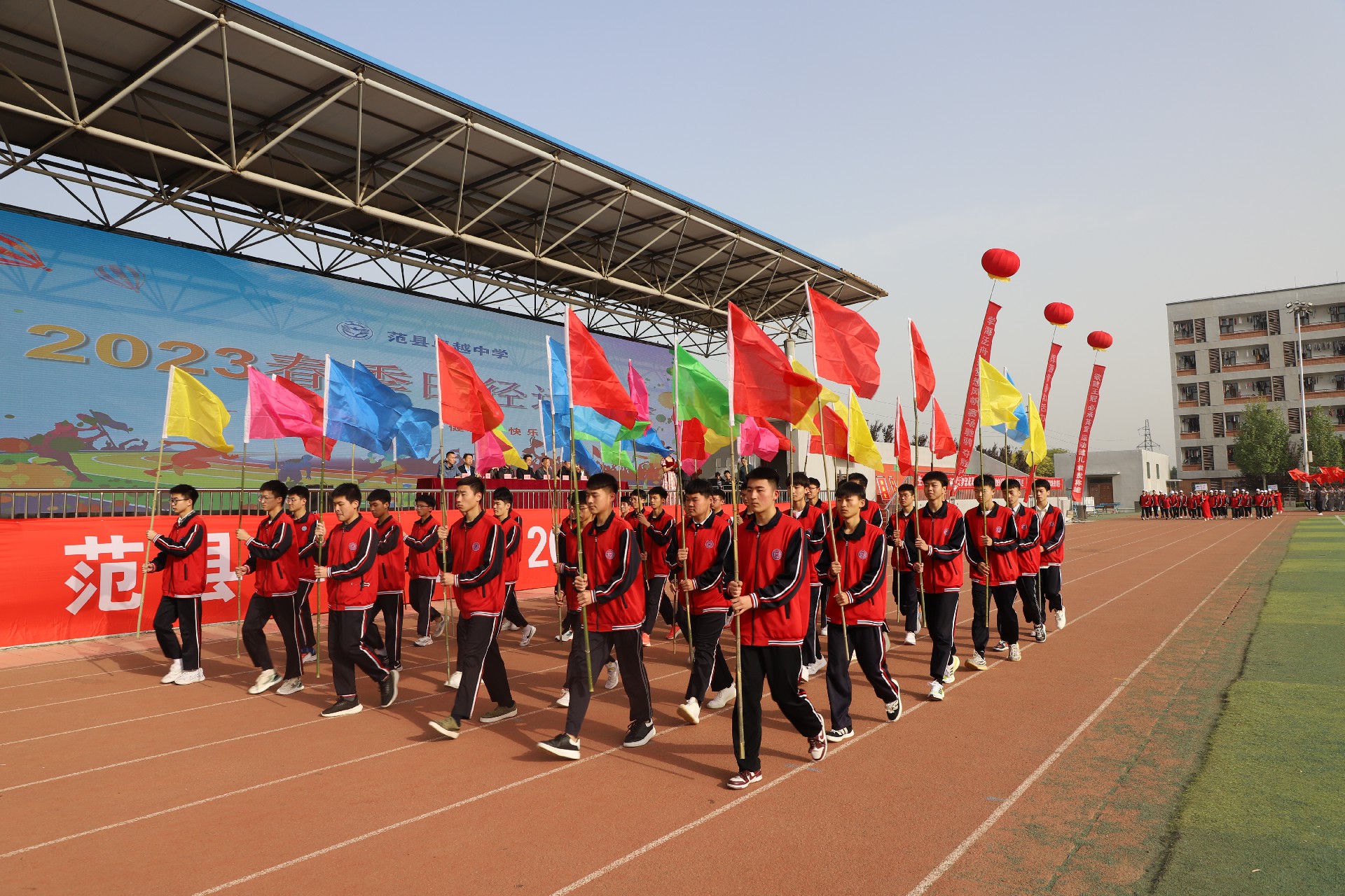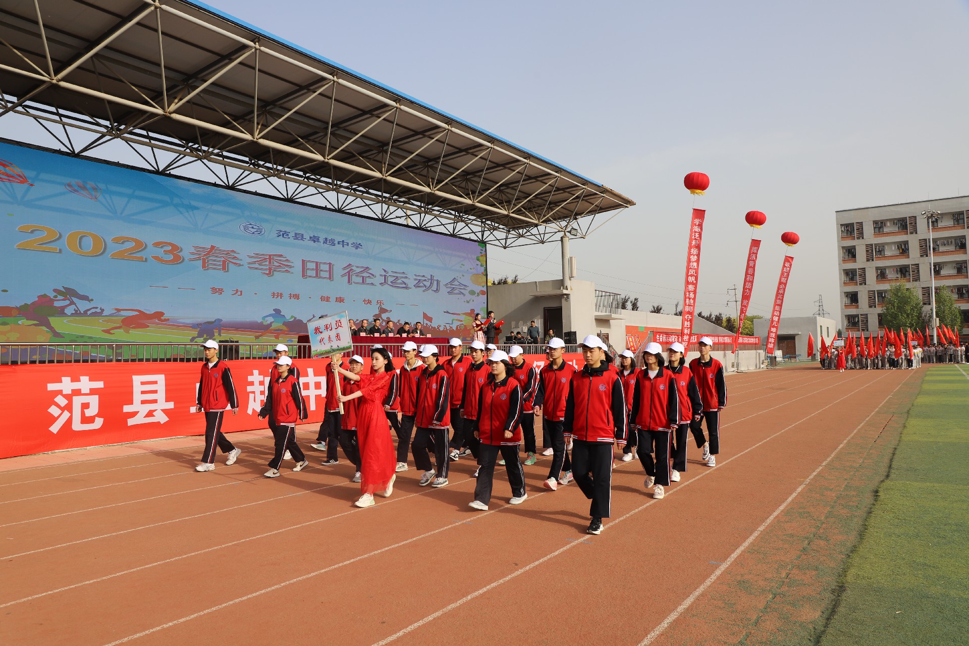 扬体育精神,展青春风采。4月14日上午,范县卓越中学2023年春季田径运动会开幕式在操场隆重举行。副校长范永继、各级部主任及相关处室负责人出席开幕式。高一、高二年级3600余名师生参加开幕式。 在欢快的《运动员进行曲》中,校旗队、校徽队、花环队、标语方队、彩旗方队、裁判员代表队、各级部运动员代表队依次入场。 各方队就位后,全体师生庄严肃立。 国旗护卫队入场升国旗 奏国歌 全场响起雷鸣般的掌声 副校长范永继致辞,他代表学校对本届运动会的胜利召开表示热烈祝贺!指出运动会的举办不仅能增强同学们的身体素质,促进身心健康成长,更能增强同学们的竞争意识、团队协作精神和自信心。 范校长强调,运动会不仅仅是一场比赛,更是一次展示自我、互相鼓励、共同进步的大会。他衷心希望每位选手要树立健康的运动观念和正确的竞争态度,充分展示自己的实力和风采,发挥出最佳水平;希望所有裁判员能够严格遵守规则,公正判罚,确保比赛的公平性和公正性。最后,范校长预祝本届运动会取得圆满成功! 运动会正式开幕! 操场上彩旗招展,掌声四起,成了一片欢乐的海洋。 随后,裁判员、运动员到达指定地点做准备,各项目比赛正式拉开帷幕。