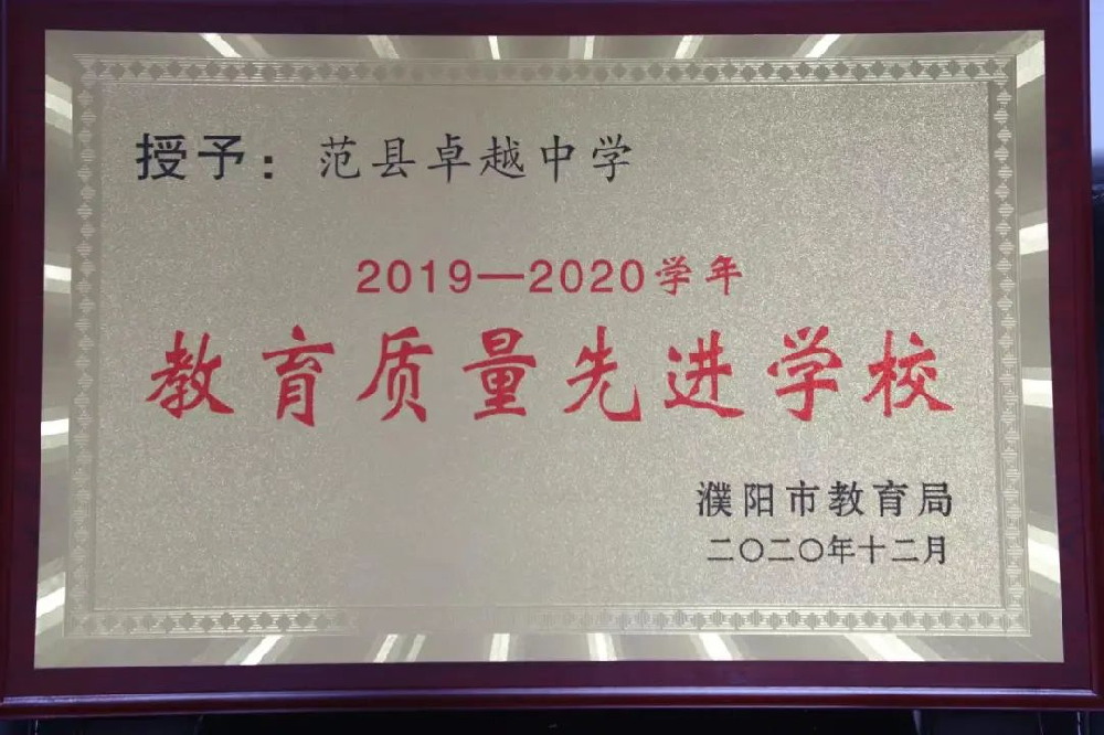2月22日,在市教育局召开的2021年度全市基础教研工作会议上,范县卓越中学被濮阳市教育局授予“教育质量先进学校”、“质量提升先进学校”、“特色发展先进学校”荣誉称号,范县卓越中学高三年级组被授予“市先进年级组”荣誉称号,范县卓越中学语文组、数学组、理科综合组分别被授予“市先进教研组”荣誉称号。 逆水行舟用力撑,一篙松劲退千寻。范县卓越中学将以努力创建“管理一流,质量一流,师资一流,服务一流,环境一流”的名牌中学为目标,凝心聚力,艰苦奋斗,继续发扬开拓创新,与时俱进的时代精神,谱写发展新篇章。
