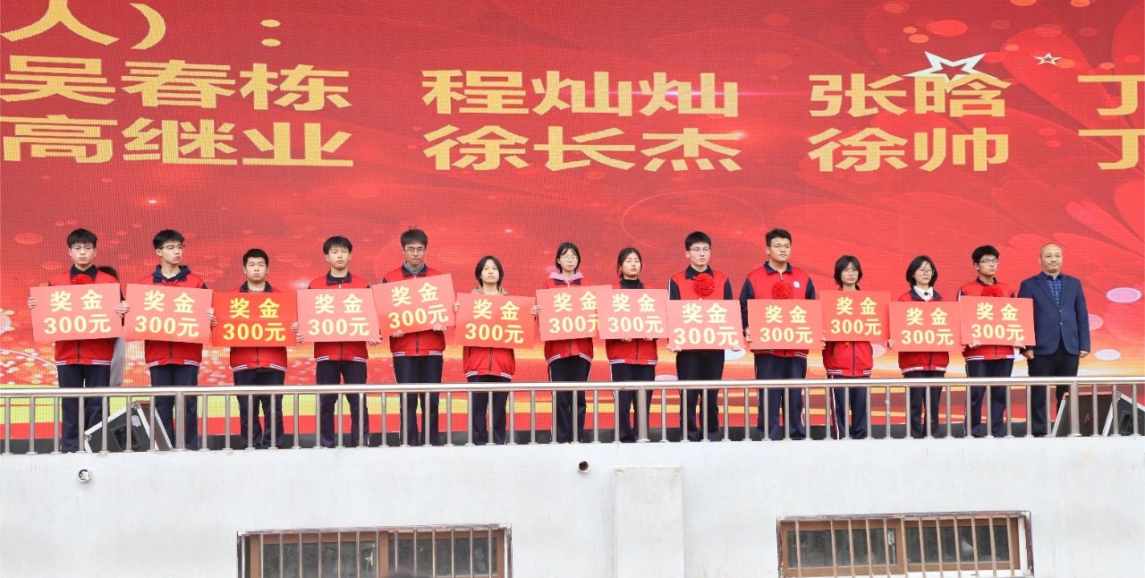 校长于世亮及相关领导干部、老师为受到表彰的考试成绩优胜者颁奖。