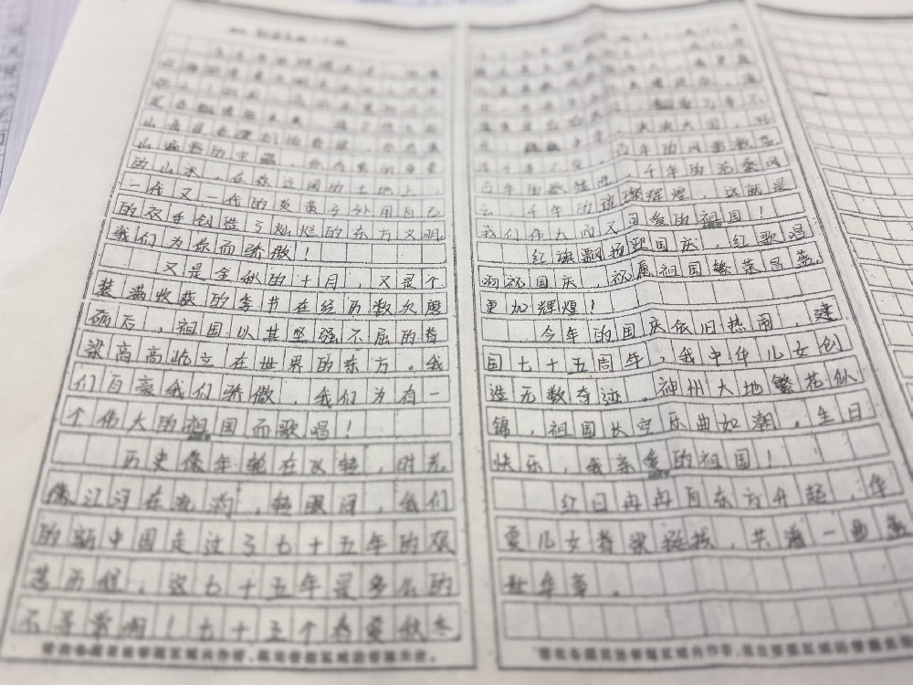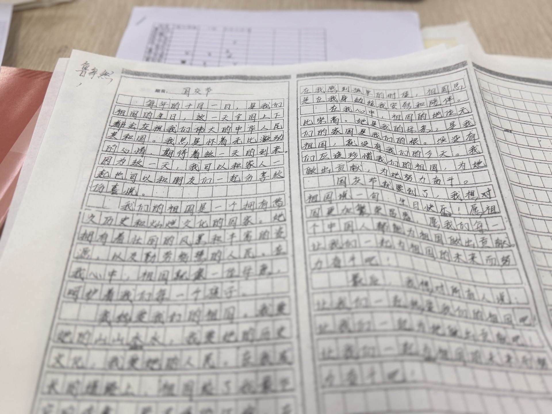 自9月20日活动启动以来,同学们围绕“祖国记忆”“家乡变迁”“身边温暖”等方向展开创作。有的同学以奶奶讲述的老故事为切入点,描写从黑白电视到智能大屏的生活变化;有的聚焦校园里的初三年级王同学在文中写道:“爱国不是宏大的口号,是爷爷种的每一棵庄稼,是我作业本上的每一个对勾。”