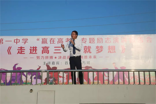 为鼓舞高三师生的士气,激发学生备战高考的学习热情,我校特邀全国知名青年励志演说家、全国中高考励志教育普及推广专家、方可教育品牌创始人方可老师,2019年7月7日在操场为高三师生献上一场精彩的励志演讲会,政教处主任、高三年级B部主任丁兆荣主持此次报告会。