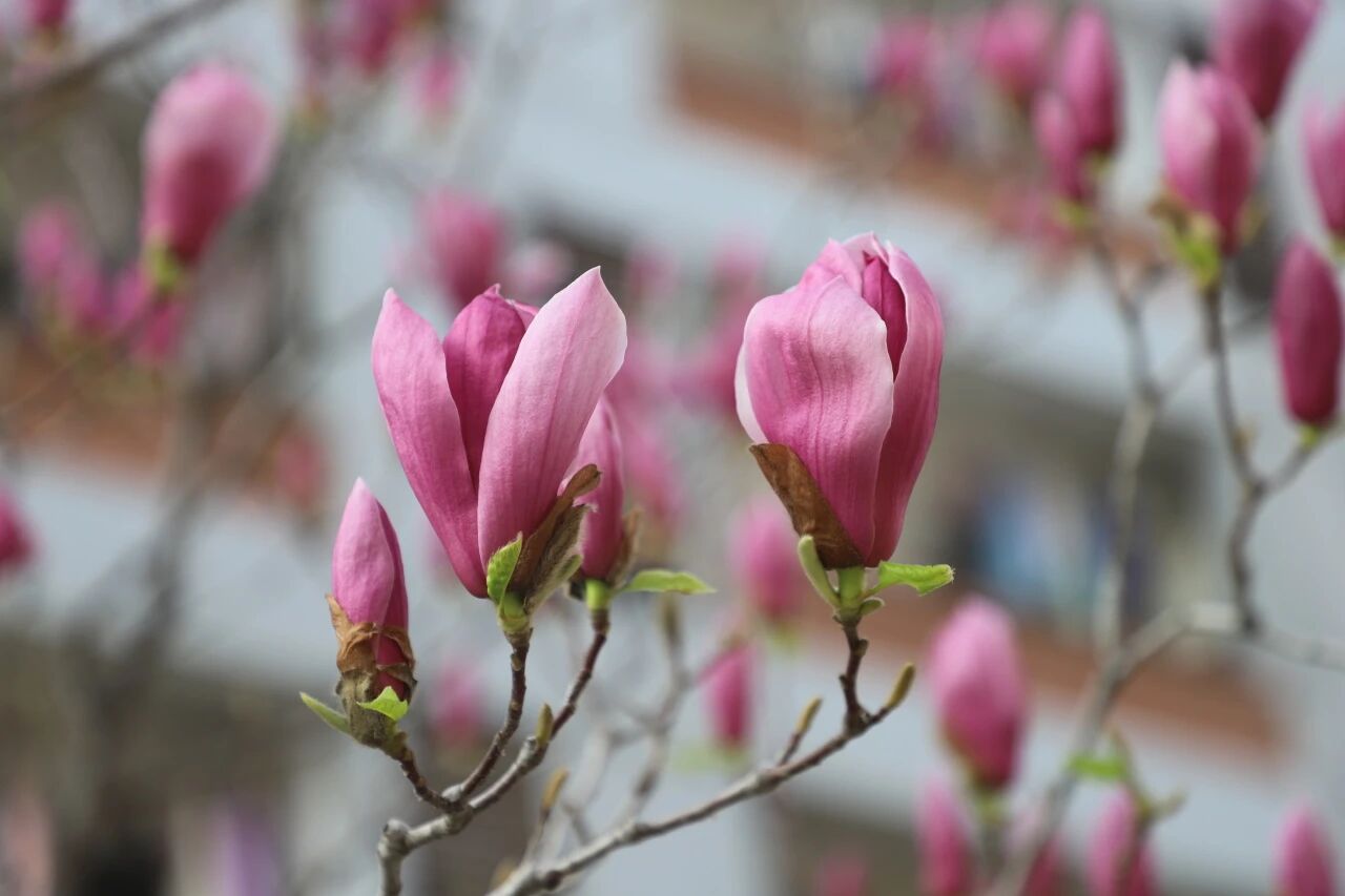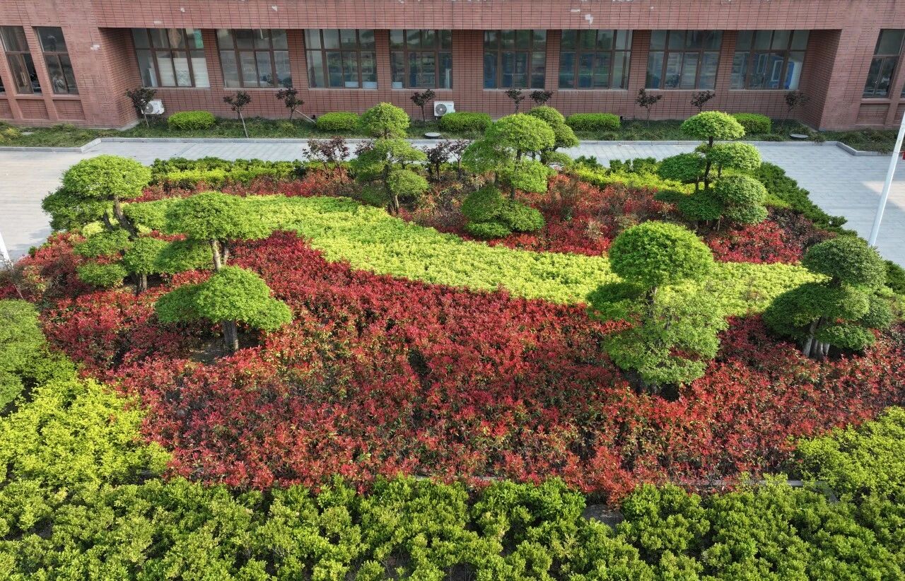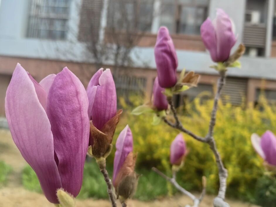 清晨,阳光穿过教学区的连廊,把知识的殿堂悄悄串联。楼宇之间,小花园里正低语轻诉——“枫叶欲残看愈好”,红枫吐了新叶,红叶李捧出碎花,玉兰擎起满树华盏,端庄地立在春光里。
