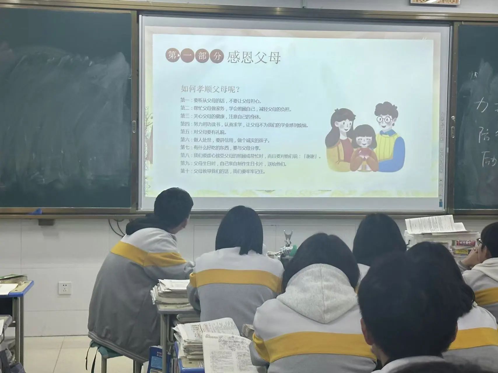 课堂上,各班班主任带领学生一起观看感恩视频、讲感恩故事、读背感恩诗文,通过多种方式增强学生感恩意识,提高学生的人文素质和思想道德修养。课下,同学们以各种形式表情达意,将感恩之心付诸于行动。