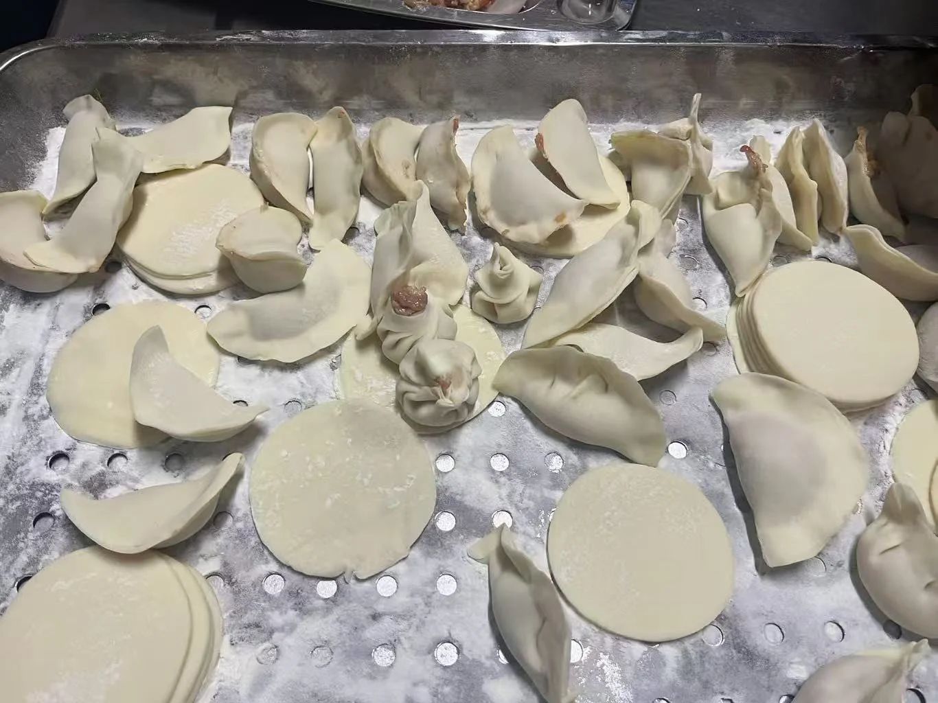 食堂里,同学们分工明确,有的负责擀皮,双手舞动间,一张张厚薄均匀的饺子皮飞落桌面;有的专注包馅,将馅料填得满满当当,再把饺子皮捏出精致的褶子。期间,欢声笑语不断,现场热闹非凡。