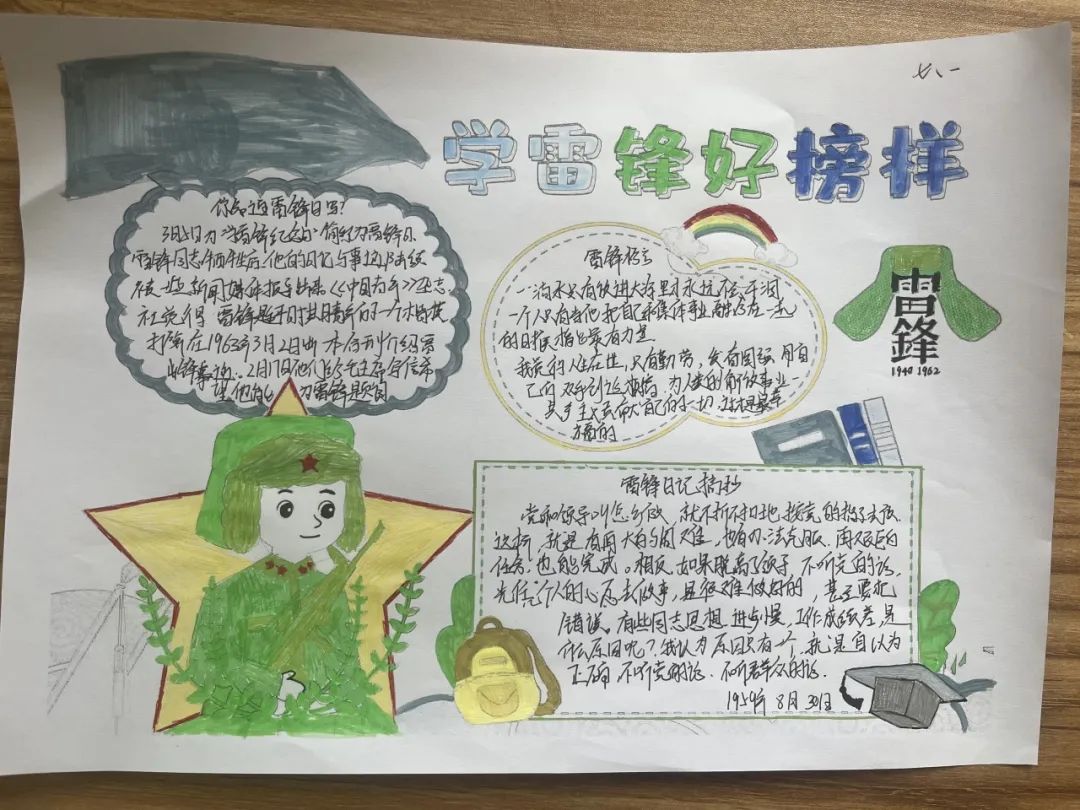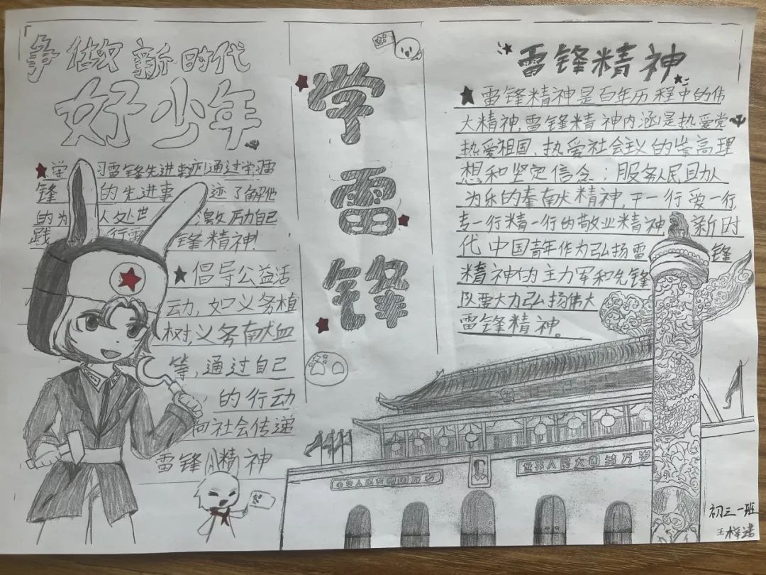 手中笔,心中念,同学们精心准备,在版面设计、内容选编、文字排版、插图描绘等方面下功夫,把对雷锋的崇敬和怀念之情融入到手抄报创作之中,对雷锋事迹、雷锋精神进行全方位展示。