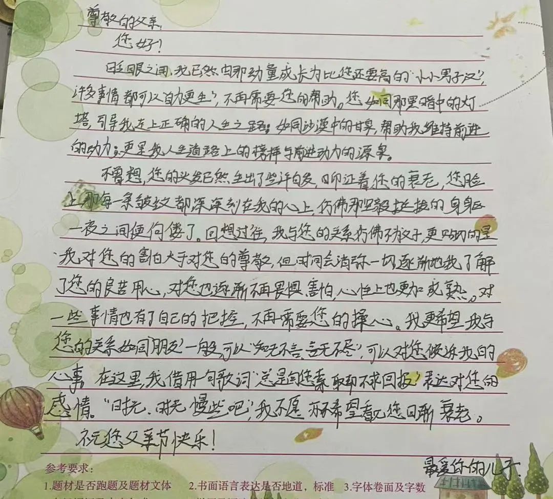 爱,是表达,更是行动。孩子们拿起画笔,将最真挚的感谢、温暖的回忆、俏皮的祝福或深藏心底的小秘密浓缩在一幅幅手抄报中,传递心底的告白;录制暖心语音或视频,“爸爸,您辛苦了!”“爸爸,我爱您!”“爸爸,您是我心中的大英雄!”……清亮的声音里流淌的是最直接的心意;用文字书写感恩,一封封写给爸爸的信中,字里行间满满的理解、感激与成长感悟。