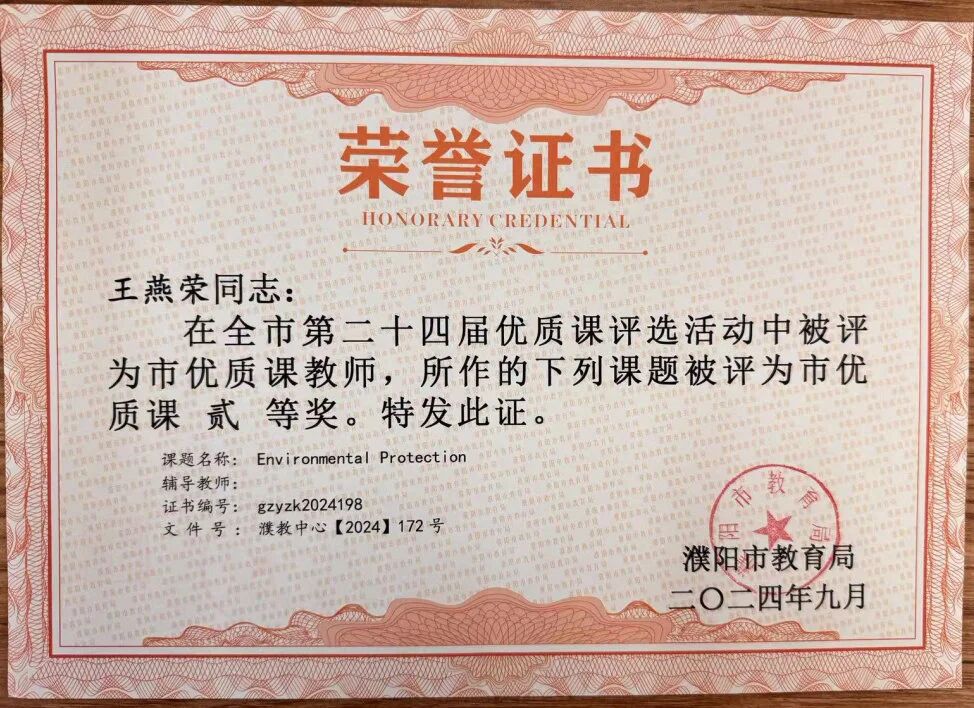 荣誉记录:先后获得“市优质课二等奖”“校优秀班主任”“校优秀教师”等荣誉。